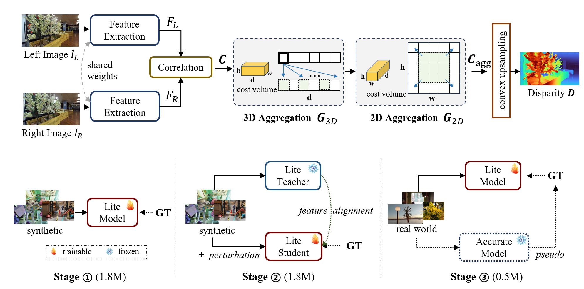 Stage 1: The lite model is trained using a standard supervised setup on a mixed of synthetic datasets including 1.8M labeled stereo image pairs. Stage 2: Self-distillation is employed, where both teacher and student models are initialized from the Stage 1 weights. The teacher receives clean data, while the student is fed perturbed inputs to encourage learning of domain-invariant representations via feature alignment. Stage3: The lite model is fine-tuned on unlabeled real-world data using pseudo labels generated by a frozen accurate model.